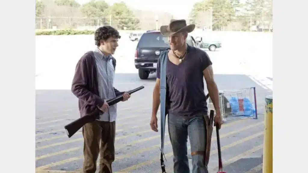 Image Credit: Sony Pictures Releasing. Zombieland is a comedy following four strangers making their way through a post-apocalyptic zombie apocalypse in an attempt to find a zombie-free sanctuary. It stars Jesse Eisenberg, Woody Harrelson, Emma Stone, and Abigail Breslin.