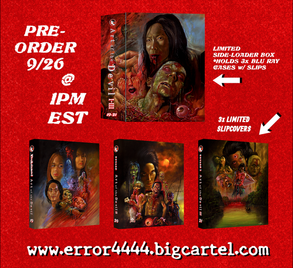 Credit: Error 4444 The good folks at Error 4444 continue to do the lord's work by giving underseen Asian horror gems a new lease of life with stacked releases. Up on the docket this month is all three films in theย Art of the Devil series, some of the most disturbing and gory movies to come from Thailand. The limited edition region free release comes with brand new HD restorations of each movie, new essays, both video and written, new interviews with director Puttipong Saisrikaew, newly commissioned art cards and – best of all for all you tchotchke collectors – STICKERS!