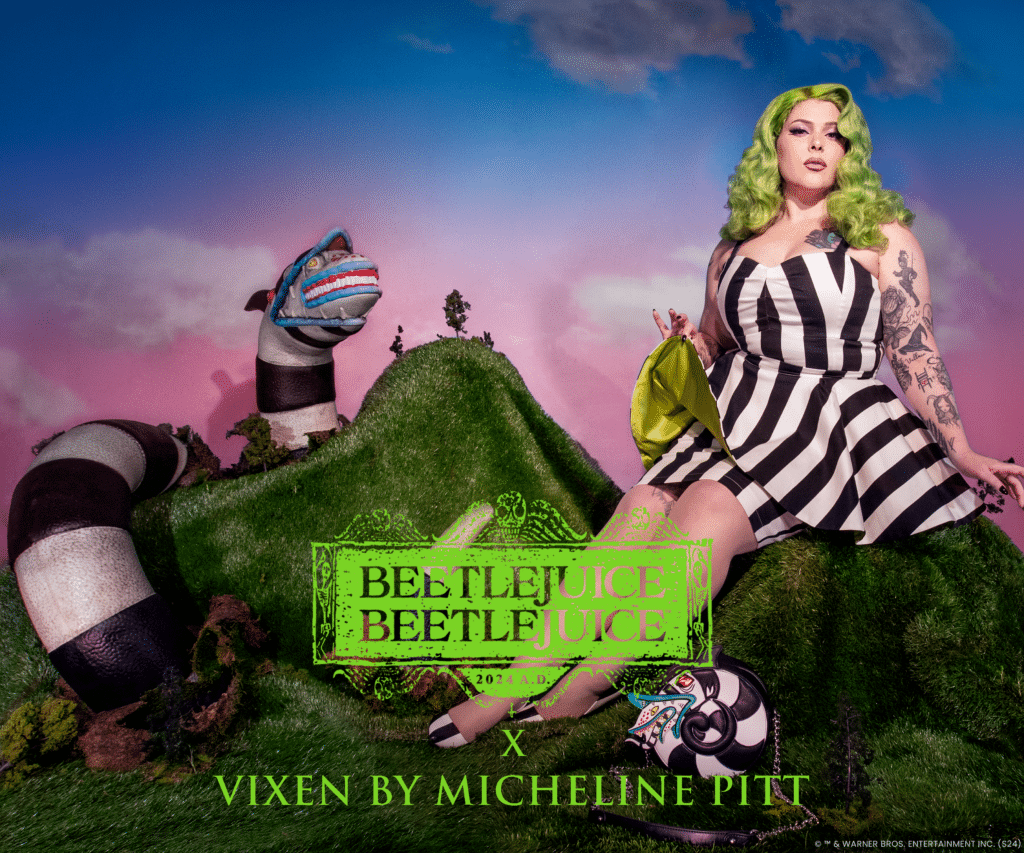 Vixen by Micheline Pitt & La Femme En Noir just dropped another banger collection, this time featuring apparel and accessories inspired by the original 1988 classic Beetlejuice and the newly released sequel, Beetlejuice Beetlejuice.