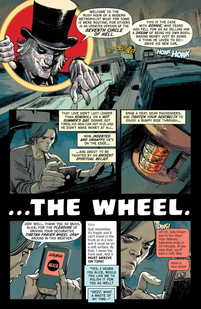 Albuquerque is paired with writer Rafael Scavone for โ€œThe Wheel,โ€ a story where a courier is attempting to deliver a priceless Tibetan relic, only to have a date with disaster when he runs down a pedestrian and karma comes to get him. Catacomb of Torment #8 also features stories by Paul Tobin and Arjuna Susini, and Robert Menegus and Valeria Burzo, with covers by Ariel Olivetti, Tom Fowler, Chris Oโ€™Halloran, Shawn McManus, and Patricia Martรญn.