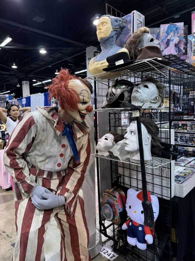 In the newly released images, Frendo stalks con attendees inside the convention center and outdoors, taking photos and menacing anyone who tried to get his way, similar to his invasion of SXSW during the filmโs premiere. He even met up with fellow murderous clown Art from the Terrifier franchise โ or at least, a cosplayer dressed as him. This all occurred while stars Katie Douglas, Aaron Abrams and Will Sasso, as well as director and co-writer Eli Craig led a panel about the film, which hits theaters next month.