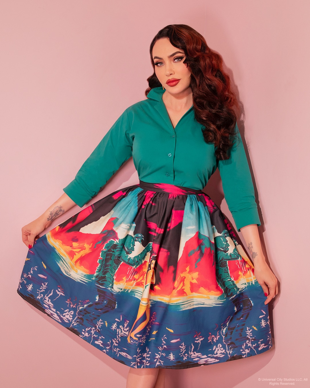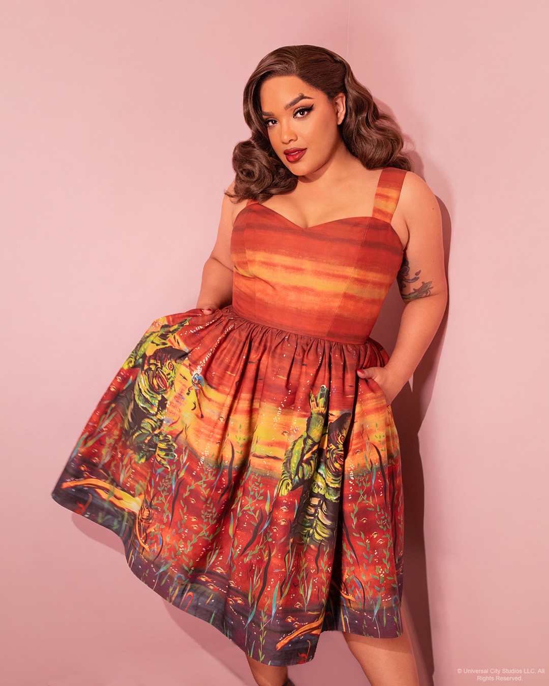 โEach collection, like the films on which they are based, has its own story to tell, and its own style, and as one of the first female owned fashion brands to have ever licensed a horror property,โ stated Pitt, โweโre excited to celebrate Creature From the Black Lagoon through fashion, having been a lifelong fan of the Universal Monsters.โ