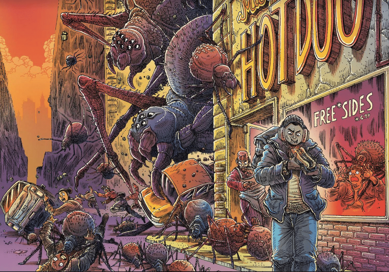 โIโve been obsessed with giant-animal horror stories ever since seeing Them! and Gila! as a kid. All Eight Eyes is both an ode to the thrills of watching oversized predators chow down on humans and a reckoning with how much NYC has changedโnot always for goodโsince the turn of the century, drawing on my own time in the East Village and Alphabet City. Iโm so thrilled to be making this arachnid gross-out alongside Piotr, Brad, and Hass. The detail Piotr brings to not just the creepy-crawly aspects of the book, but to every chipped brick and sticky sidewalk of NYC, is unmatched, and Brad and Hass match his skill page for page.โ