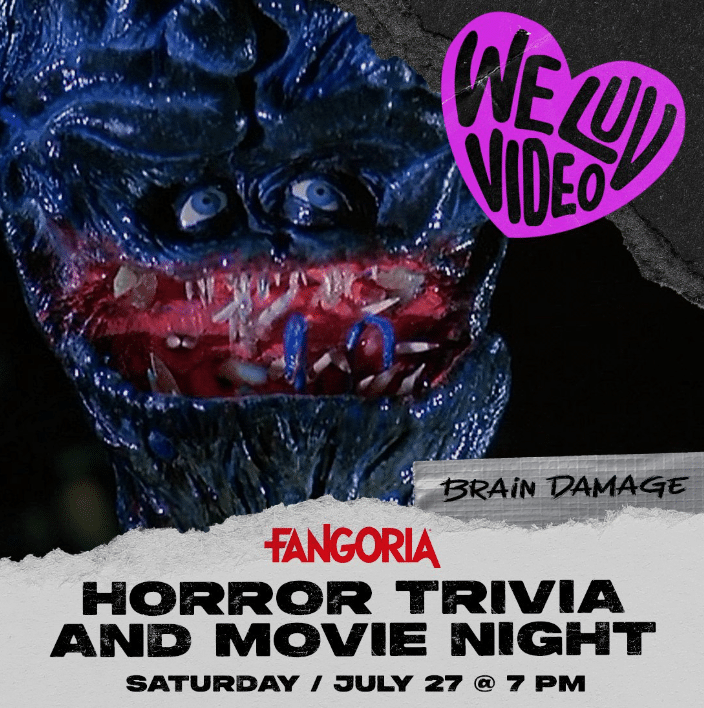 Join us for a night of delicious macabre delights as We Luv Video partners with horror favorites Fangoria! Test your deepest, darkest horror movie trivia skills and win frightful Fangoria prizes. Afterwards, enjoy a screening of the underseen classic, Brain Damage. What a night! Exclusive FANGORIA merchandise will be available on-site, and Fango's Creative Director Jason Kauzlarich will be in attendance. Also: FREE beer while it lasts. Letโs party. You wonโt want to miss this one.