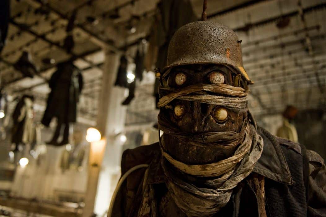 “Only the Nazis could think of this,” one of the soldiers says, but of course the bizarre fusions of human bodies and lethal mechanical devices weren’t the Third Reich’s idea. Viktor Frankenstein (Hellboy’s Karel Roden), descendant of the original notorious scientist, has been carrying on the family tradition, setting up an assembly line of bizarre hybrids through which Raaphorst, also the film’s creature designer, expresses the outer limits of his deranged imagination. As brought to life by FX supervisor Rogier Samuels and his Unreal team, the “zombots,” as they’re affectionately monikered in the credits, are a most impressive array of practically created monsters. Some are fearsome and frightening, while others are grisly walking sight gags; my favorite is “Mosquito” (Klemens Patijn), which walks around on stiltlike blade-limbs and sports a long drill-proboscis that makes short work of human heads and torsos. Another highlight—of which all I’ll say is that it involves a teddy bear—is both horrifying and hilarious at the same time.