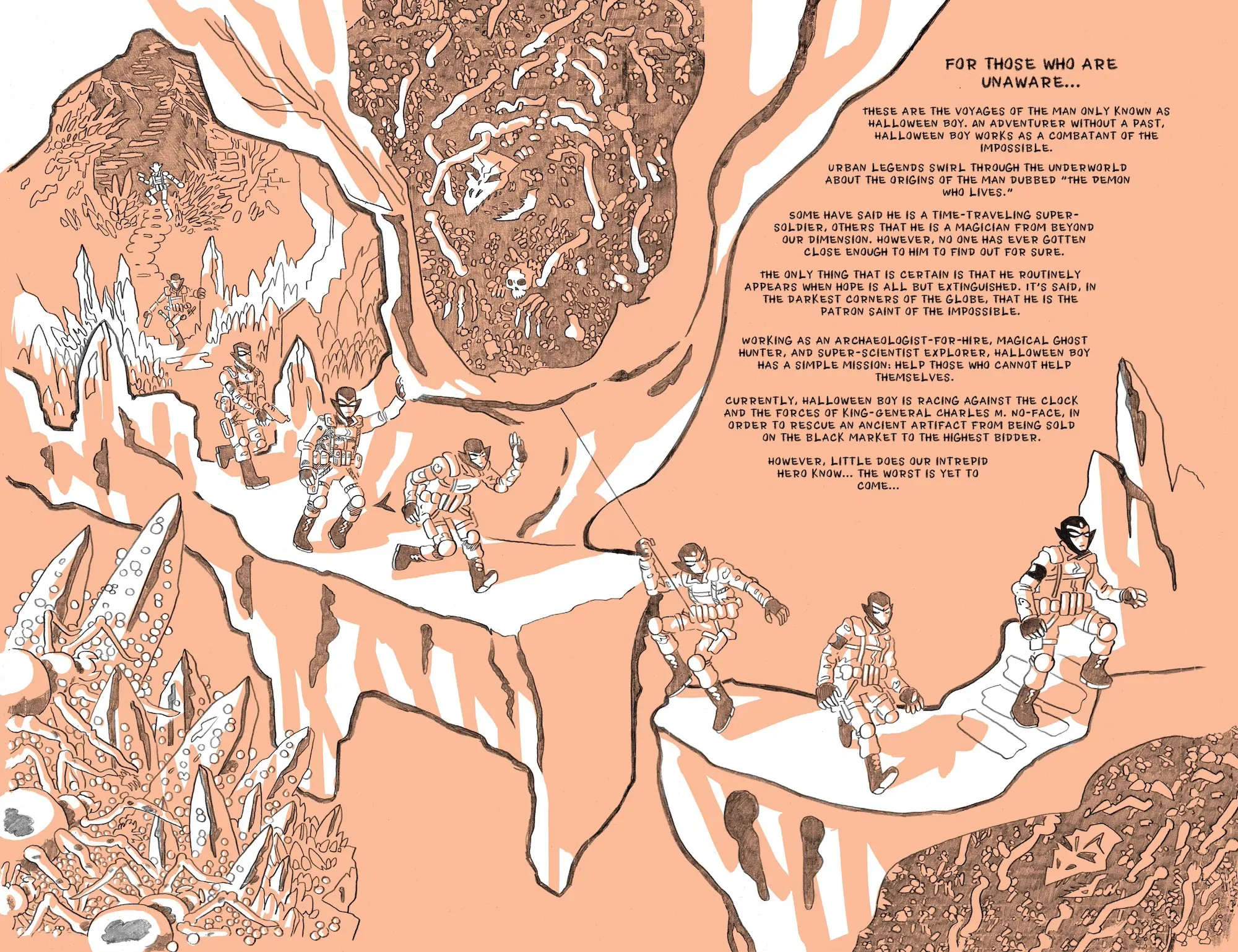 Working as an archaeologist-for-hire, magical ghost hunter, and super-scientist explorer, Halloween Boy has a simple mission: help those who cannot help themselves. From routine artifact rescues gone wrong to helping the surviving members of an ancient religion enact a cosmic funeral dirge, Halloween Boy finds himself operating as the patron saint of the impossible. And yet, just how long can he win in this never-ending battle before things spiral out of control? When will the dark secrets of the Demon Who Lives finally rear their ugly heads? Find out in the pages of this thrilling compendium!