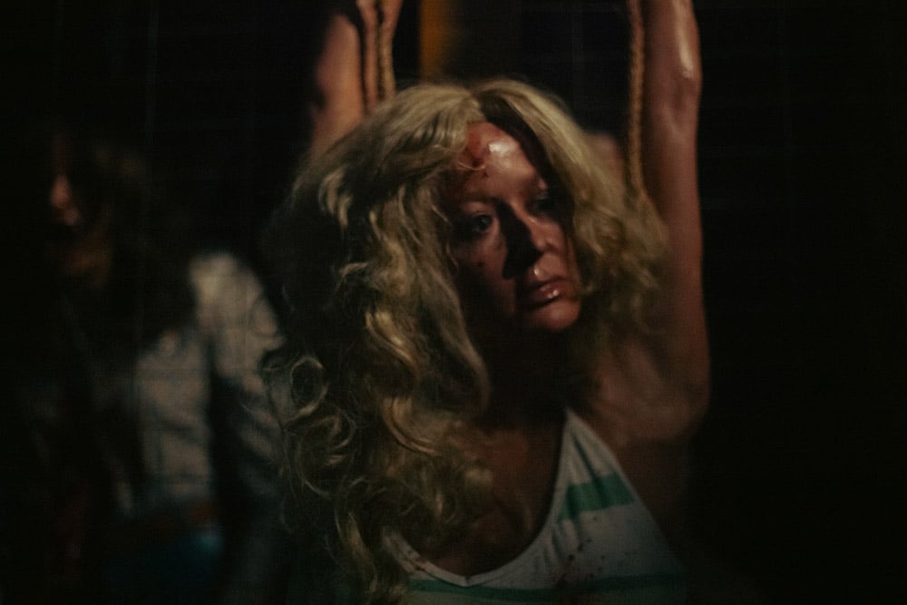 We make our way through a refrigerated room which the Sawyer family has clearly not kept cold. (Pretty sure all this meat's gone bad!) Navigating through curtains of human skin, doing my best to not let it touch my face.