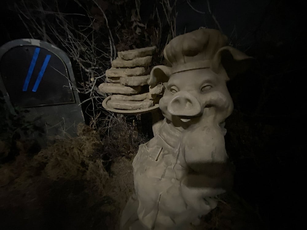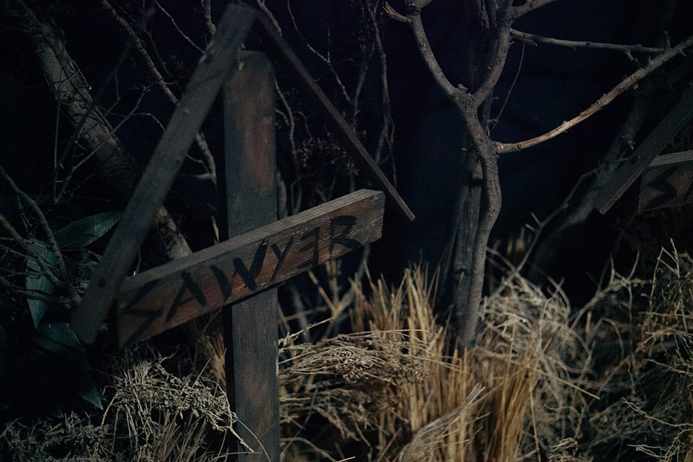 A cemetery scene featuring burial plots for various Sawyer family members prominently displays MEAT icons, the sort of pig statuary one would find out in front of a BBQ restaurant. Murdy explains that for the Sawyers, Meat is sacred. Meat is god, and thatโ€™s reflected in the iconography displayed in the family graveyard.