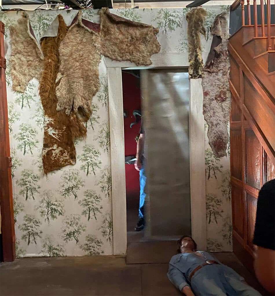 Before we exit, we end up back in the original 1974 Texas Chain Saw Massacre house. The front porch is adorned with the Sawyer version of beaded curtains, bones strung up on display. And as we step over the threshold to the house, pelts are hung on the walls, with the staircase going up to the right, and the horrifying sliding door dead straight ahead. Even without haunt actors in the house, itโ€™s unnerving to walk past the door when you know exactly what comes out of there, and what happens when he does.