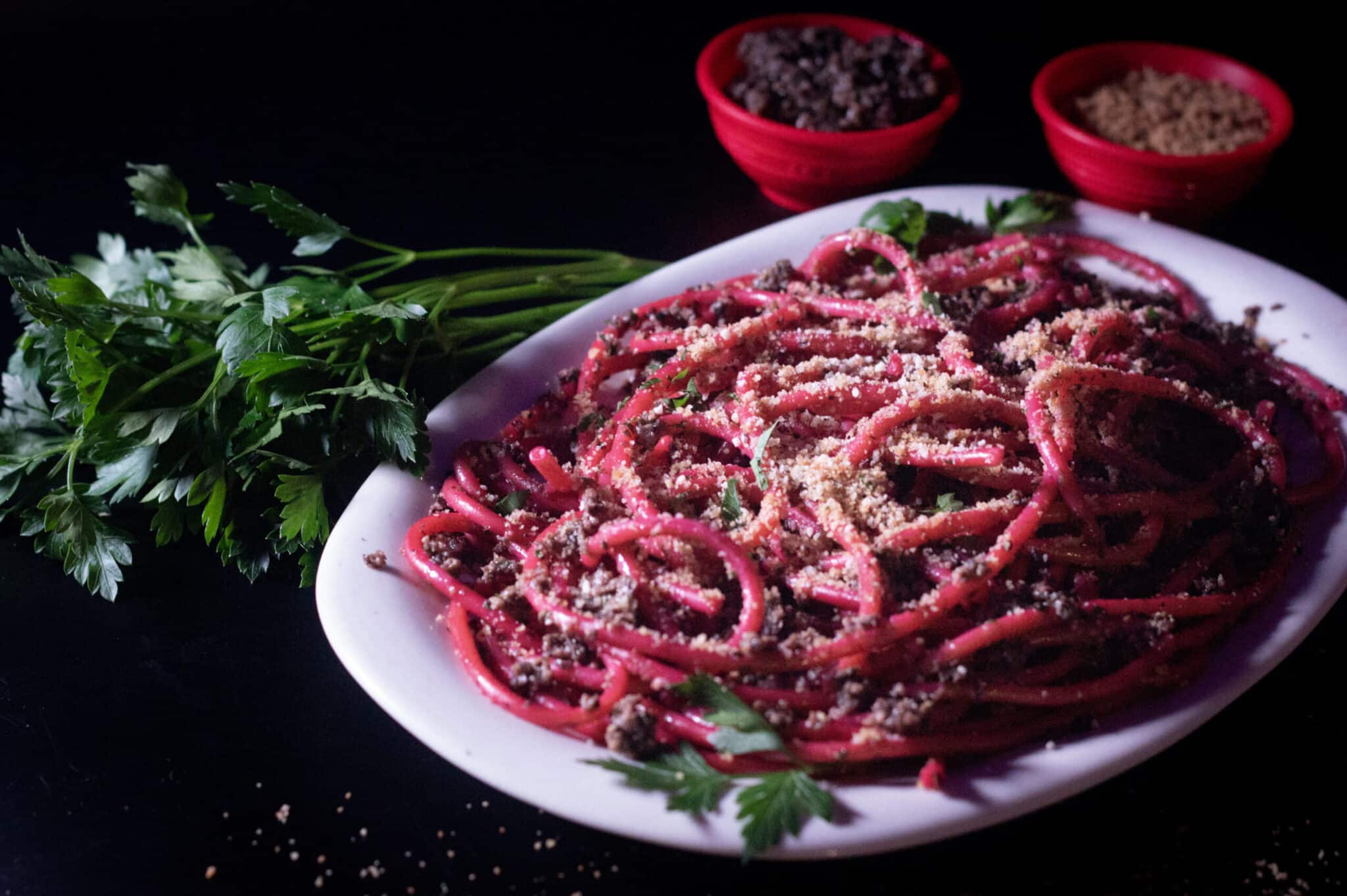 A scene from the film shows Amelia harvesting earthworms from her garden to feed the Babadook, which inspired me to create a unique themed dish โ Babadook Dirt and Worms Bucatini. I've transformed classic bucatini noodles (that's a fancy way of saying hollow spaghetti) into a creepy-crawly treat, tossing them in a homemade olive tapenade and garnishing them with parsley, breadcrumbs, and Parmesan to mimic the look of freshly dug earth โ deliciously spooky and way tastier than actual dirt and worms! Serve with freshly baked bread and a green salad for a complete meal.