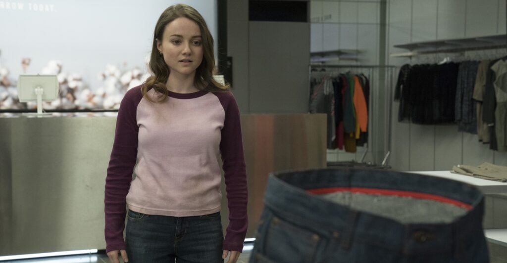 Image Credit: IMDB Slaxx takes place in a supposedly ethical clothing store the night before the launch of a brand-new product that promises to revolutionize jeans. Not only are all of the employees locked in the store, they are locked in with a sentient pair of killer pants. Is this a mall set story? I think so because most clothing stores are either in a mall, indoor or outdoor these days. Directed and co-written by Elza Kephart, this socially conscious fear film is bloody and brutal, much more than its comedic themes would suggest. It's funny as a deft horror comedy.