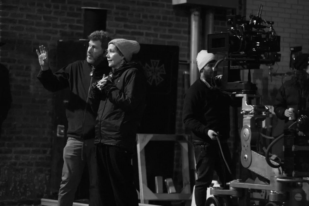 Jessie Buckley and Maggie Gyllenhaal on the set of THE BRIDE! (Photo by Niko Tavernise)