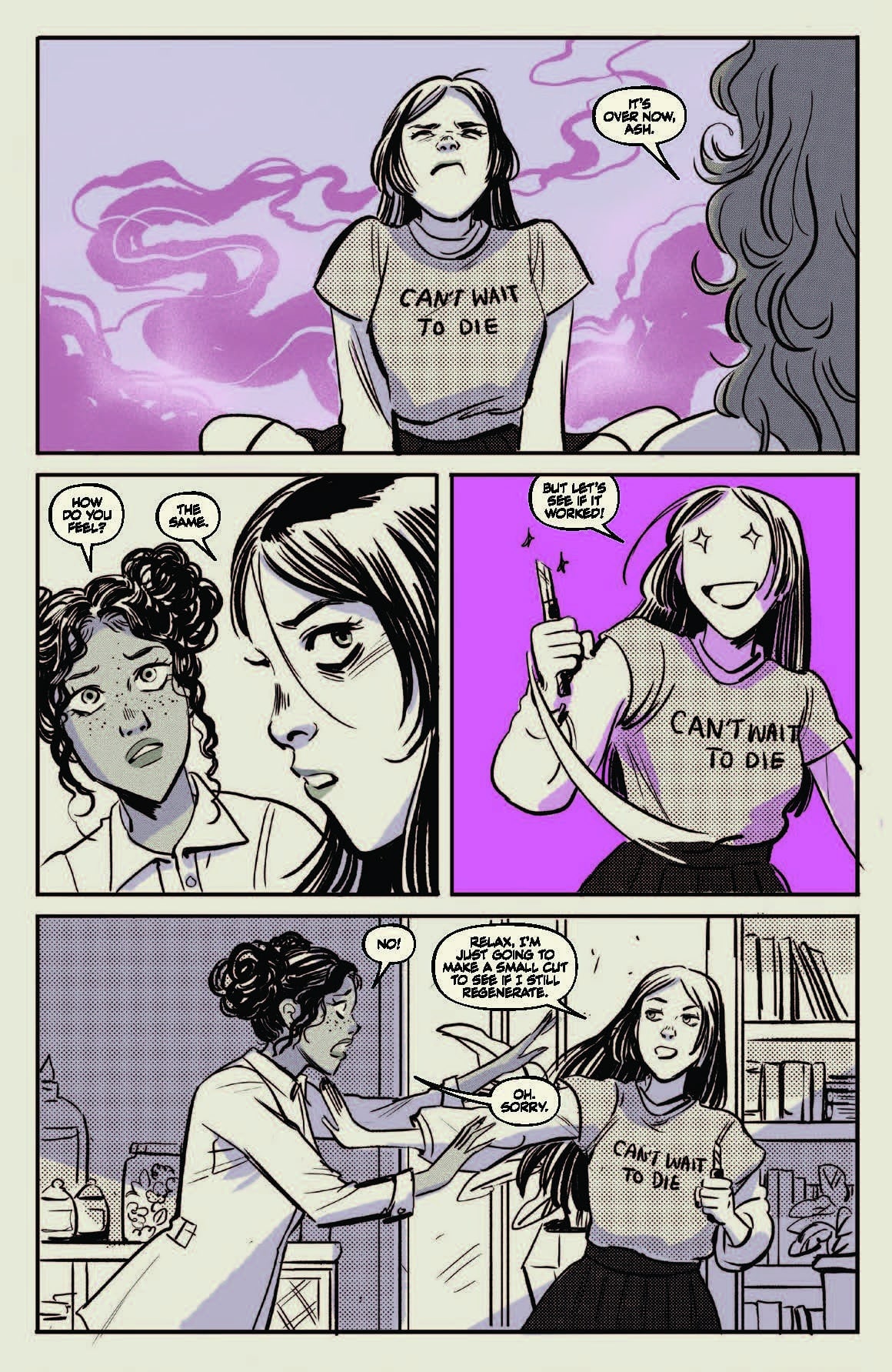 Immortality strikes again! Liv decrees the bearer of the knife shall live, and thus, it is (luckily) so. If you're in the mood for dark humor, light magic, and teen angst, you can pre-order Dying Inside right now from Vault Comics.