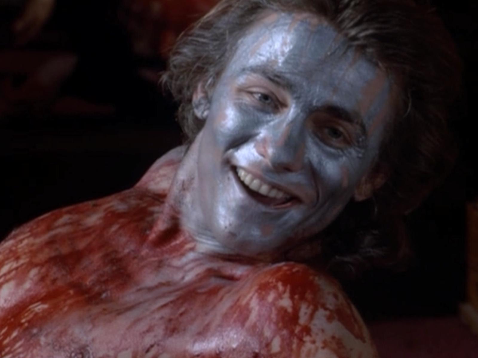 He's naked, his face painted gray like a neo-primitive, and attacks a priest, demanding blood.ย ย