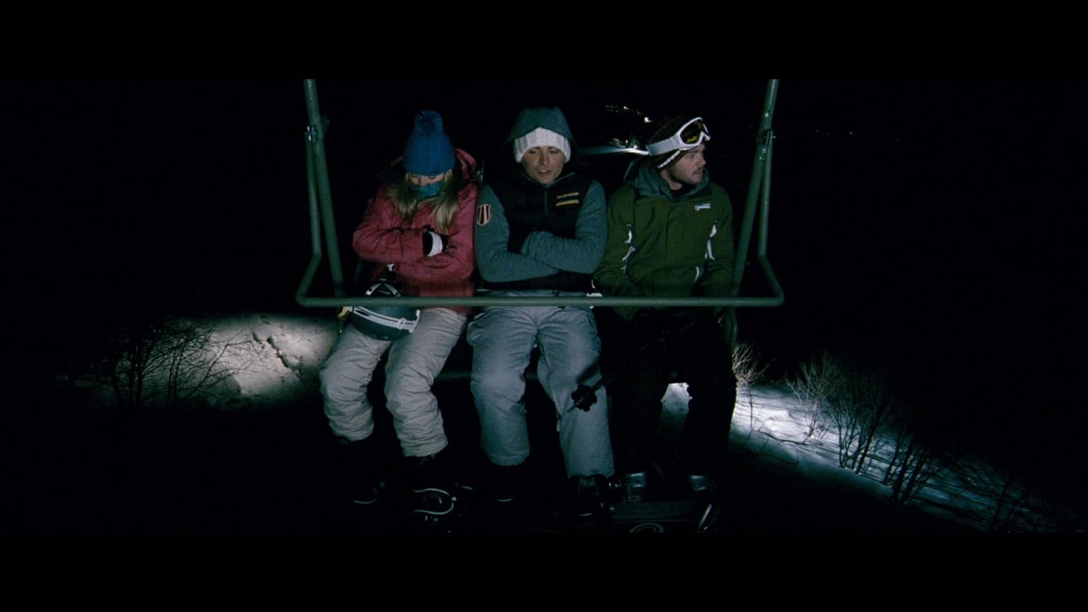 A stranded-in-the-wild survival thriller in the vein of Open Water, but shot far more formally, Frozen introduces us to best buddies Dan (Kevin Zegers) and Lynch (Shawn Ashmore) and Danโs girlfriend Parker (Emma Bell) on a weekend skiing and snowboarding vacation. Lynch isnโt too thrilled with Parker, whoโs making her first trip with the guys and getting in the way of his and Danโs bromance, but the resulting tension is nothing compared to what arises when they make the ill-advised decision to take one more trip up the slope after Sunday night falls. A series of circumstances conspire to strand them on the shut-down chair lift in the dark, halfway up the mountain, with a 50-foot drop below them, a storm moving in and nobody knowing theyโre up there.