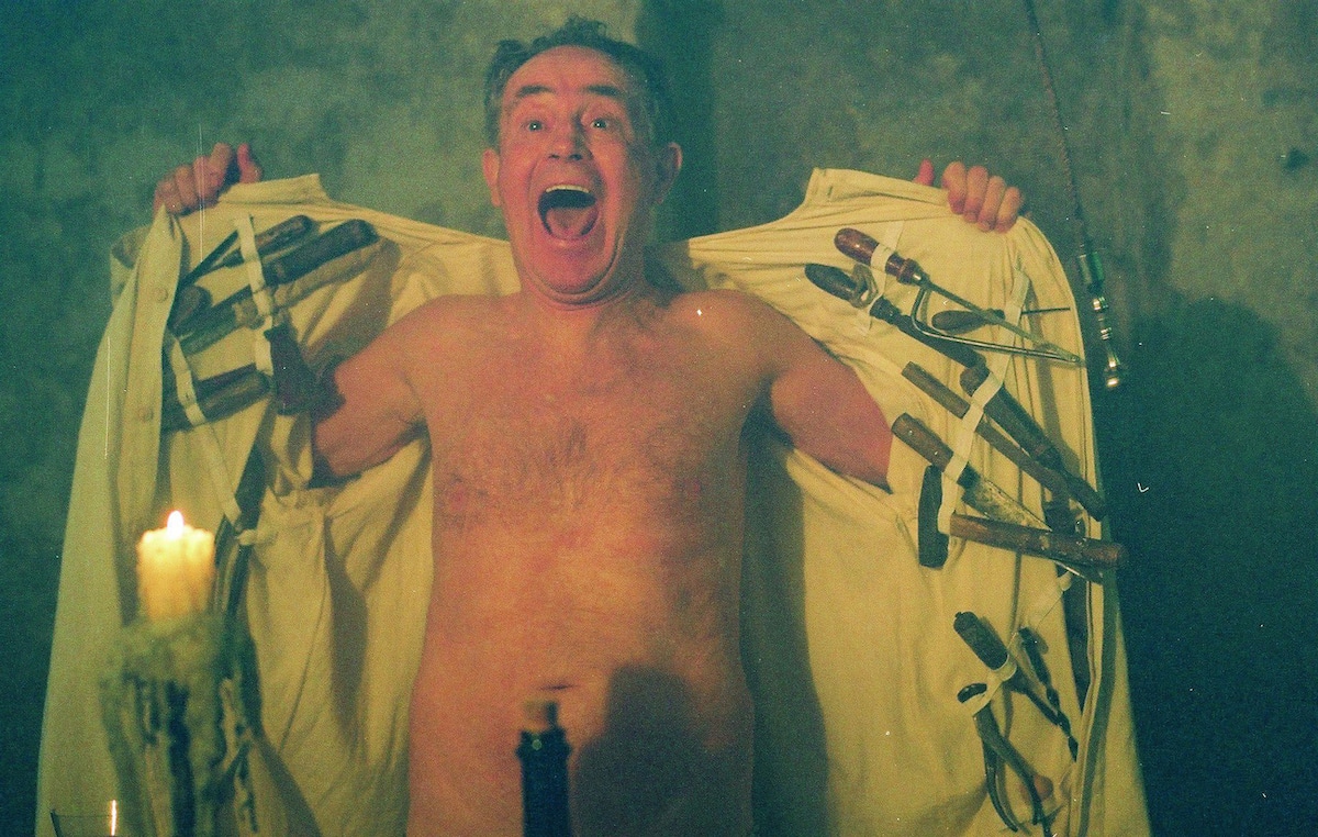 Borrowing (by Svankmajerโs own admission) from the writings of both Edgar Allan Poe and the Marquis de Sade, Lunacy finds a young man named Jean (Pavel Liska) traveling through what appears to be the 18th century, though a horse-drawn coach crosses an overpass above a highway teeming with modern cars in one scene, and a decidedly period hospital has computers on its desks. Plagued by nocturnal fantasies of men in white coats coming to take him away, Jean falls in with the Marquis (Jan Triska), a hedonist who has rejected God (โA feeble creature incapable of making people behave how he wantsโ) and indulges in blasphemous ceremonies involving religious iconography and naked girls that are right out of a โ70s Eurosleaze flick. He also has an extremely direct approach to therapy, demonstrating to the startled Jean (in the movieโs best extended sequence) his own treatment for his fears of being buried alive before suggesting the young man spend some time in a nearby asylum.