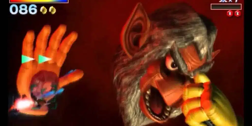 In the game, he is a giant, maniacal floating primate head and hands that laughs and taunts Fox. He will try to eat you and swipe at Fox as you pilot his Arwing. His eyes lull around in his head, his cheeks wobble grossly, and eventually, his face explodes. When that happens, he becomes a giant disembodied brain and eyeballs that also must be defeated.