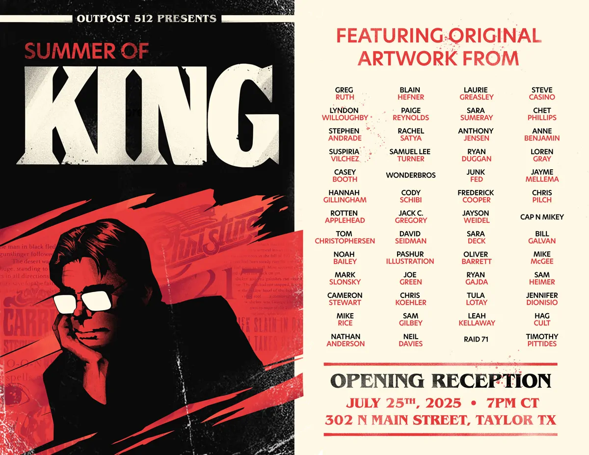 Stephen King's work is iconic. Pet Sematary, The Shining, Misery, Cujo, Carrie, It, Salem's Lot, and Christine are just a few of his stories that have become part of our collective pop culture lexicon. It's true… Stephen King rules, and this summer the world’s bestselling horror author is being celebrated with new works of art at Outpost 512 in Tyler, TX. Over 50 artists have contributed to the gallery, featuring original paintings, prints, and sculptures that pay homage to the work of Stephen King. If you are a fan of his writing, you are not going to want to miss this show.