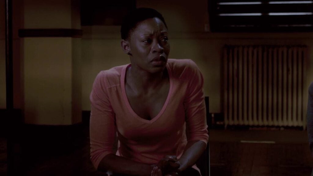 Image Credit: IMDB Sidney (Olunike Adeliyi) and her abusive boyfriend Alex (Ish Morris) are suspended above a room filled with lawnmowers upside down and running. The couple are holding on for dear life to spiky metal levers. The trap is simple; the first person to drop onto the lawnmowers ends the game. Alex has no problem trying to knock Sidney into the whirling blades, so she finally reacts, and after slapping him, he falls. This is her salvation and is one of the least difficult traps to escape from in the series.