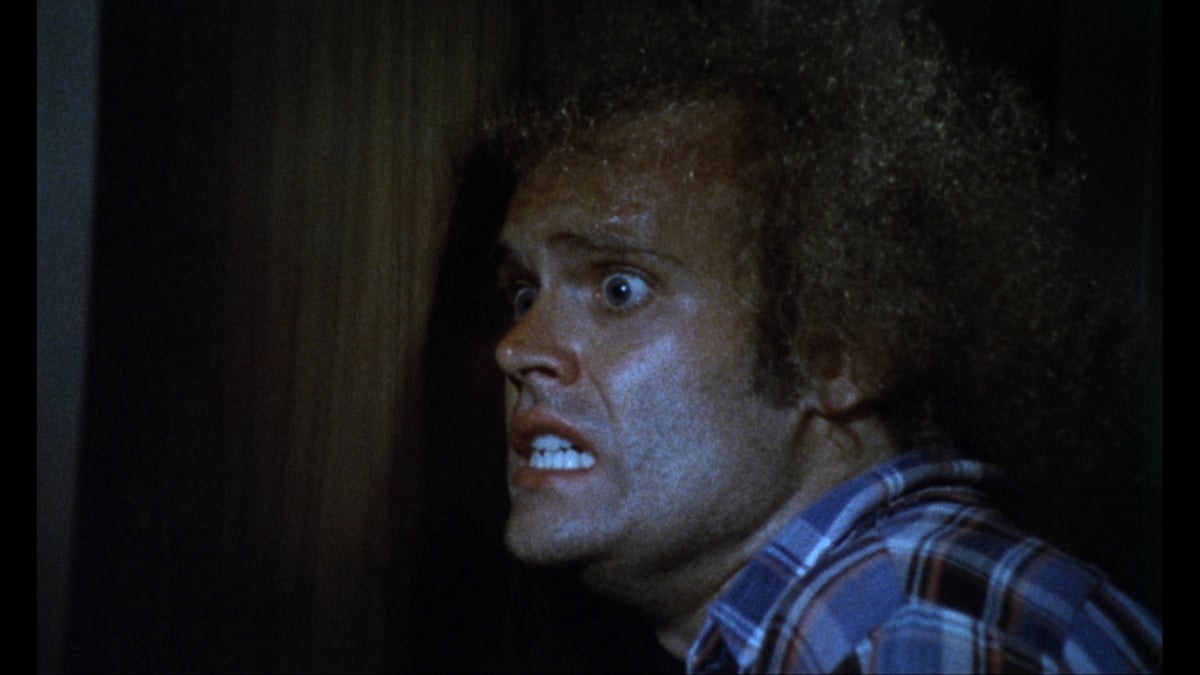 This is not to take away anything from Synapse teamโs efforts to present the most complete and best-looking version possibleโtheir new transfer is leaps and bounds past any previous home releases. But beyond the reinstatement of some MPAA-trimmed gore (which nonetheless stands as rather tame compared to what R-rated horror gets away with now), thereโs no revelation of a neglected gem here. The only movie I can recall being cited as a โDog of the Weekโ twice on Siskel and Ebertโs TV review shows, Dorm may not warrant that sort of repeat condemnation, but itโs awfully generic stuff, with all the slasher clichรฉs present and accounted for. Thereโs the isolated location (a dormitory set to be closed down), the small group of young victims-to-be (students who have volunteered to clean the place out, some of them looking too old even for grad school) led by a sensible, sweater-wearing Final Girl, a weirdo red-herring character (played by Woody Roll, pictured above, apparently because Clint Howard wasnโt available), ominous point-of-view shots, a bit of nudity that even the filmmakers admit is gratuitous, phones that go dead shortly before the coeds do and a missing power tool that reappears later for some drastic misuse.