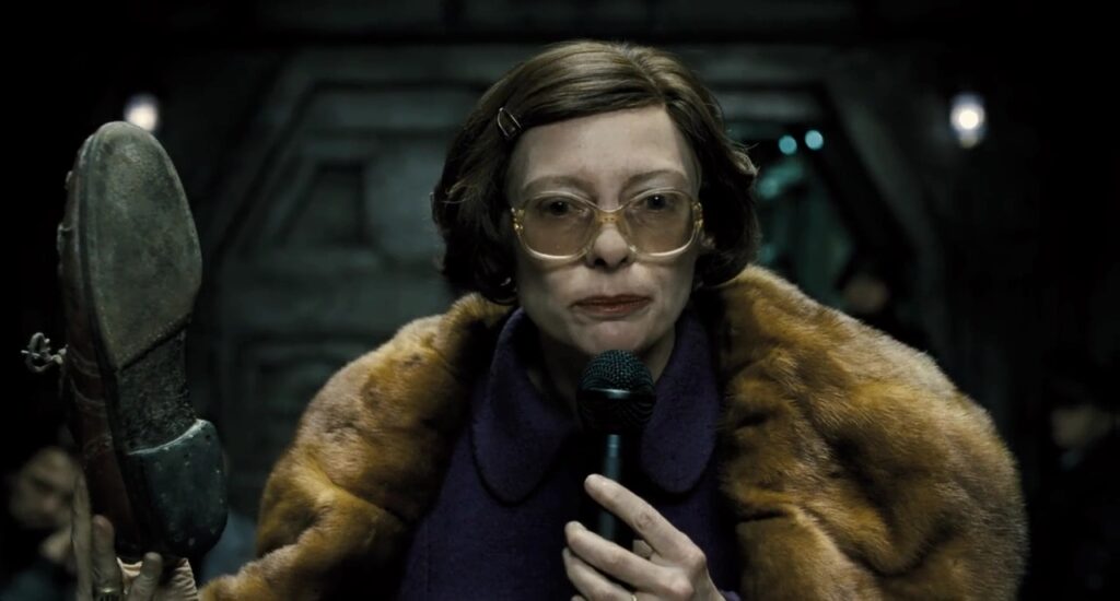 Image Credit: IMDB In this post-apocalyptic story of a train that is on an eternal track through the ruins of an Earth that has suffered a climate catastrophe, Swinton plays Minister Mason, the evil mouthpiece of the creator of the train. Swinton was ready to adopt the most outrageous costume and make-up to play a hideous person, but director Bong Joon-ho pulled her back from the edge. As it is, the portrayal is striking, and her villainy is more than memorable. Read more: Q&A: John Hurt On His Futuristic Trip In Snowpiercer.