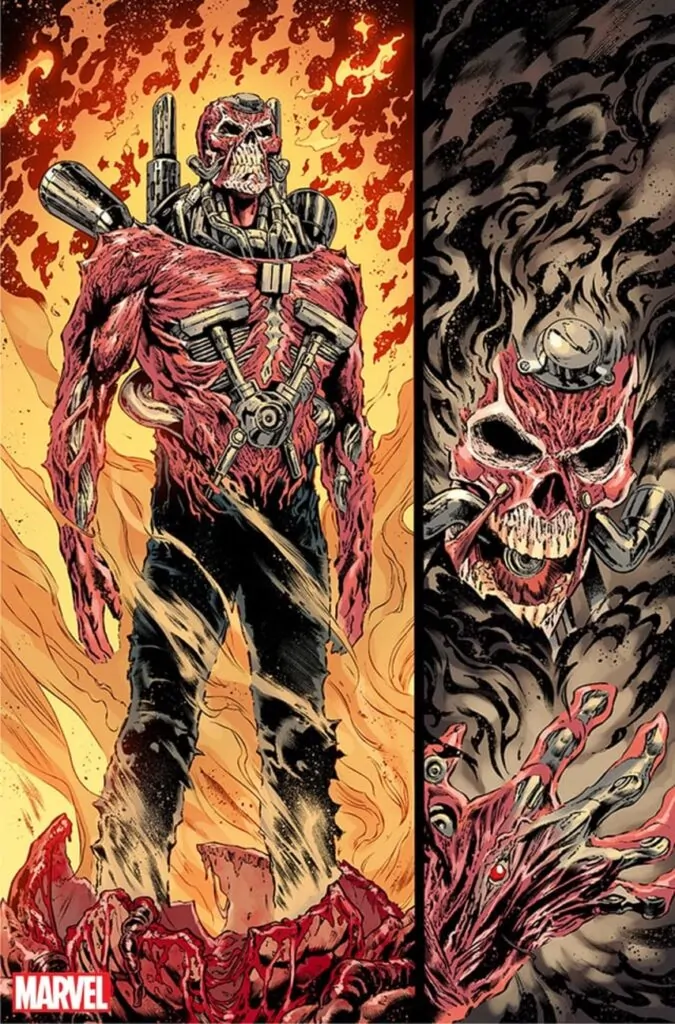 Jim Lee once told me the best character designs can be recognized in silhouette and thatโs certainly true for many of our favorite horror baddies. You donโt need a flashlight to know Freddy or Frankensteinโs creature or Pinhead is emerging from the shadows. I kept this in mind when Cory Smith (the artist) and I created Exhaust, a villain in Ghost Rider who looks like someone rode a Harley into a wood chipper, a coughed-up combo of exposed muscle and bone and chrome piping.