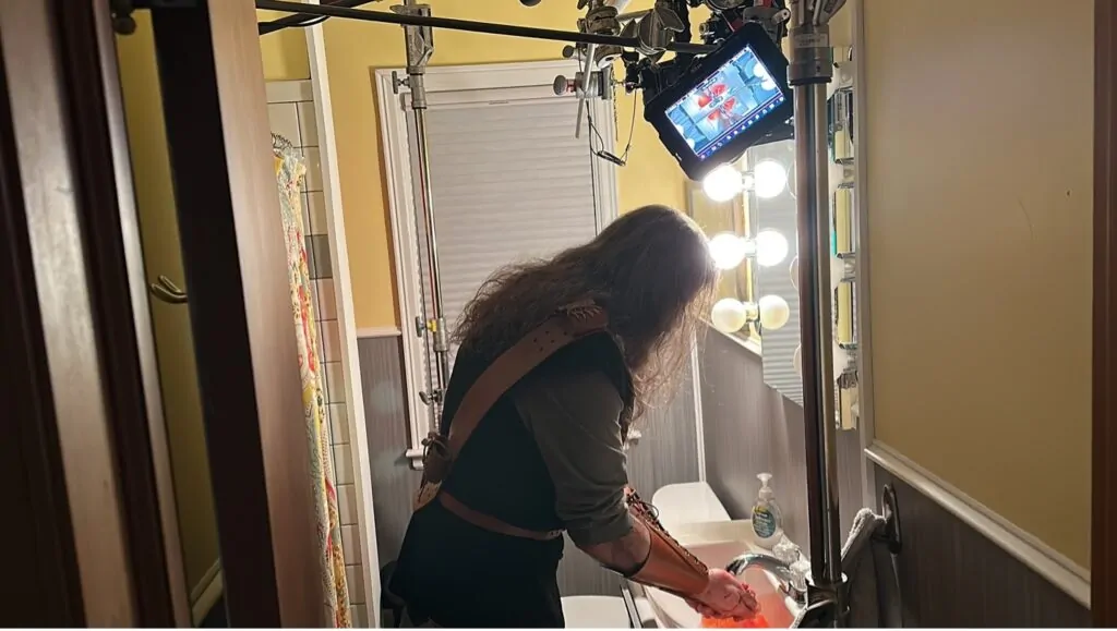 I wanted to find ways for this oppositional theme to play out in the staging and design of the production. So reflections can be seen throughout the short. Jacob takes a Polaroid of each of his victims. Jacob flicks his haunted eyes toward his rearview mirror after he drives home from a killing. We staged the bathroom shot from above, so that the mirror reveals two versions of Jacob washing the blood off his hands. We hung long mirrors on either side of the dining room table so that when Jacob and the Agent sat opposite each other, they would be twinned in more way than one. We stood them on either side of a doorway, one in light, the other in shadow, their postures mimicking each other.